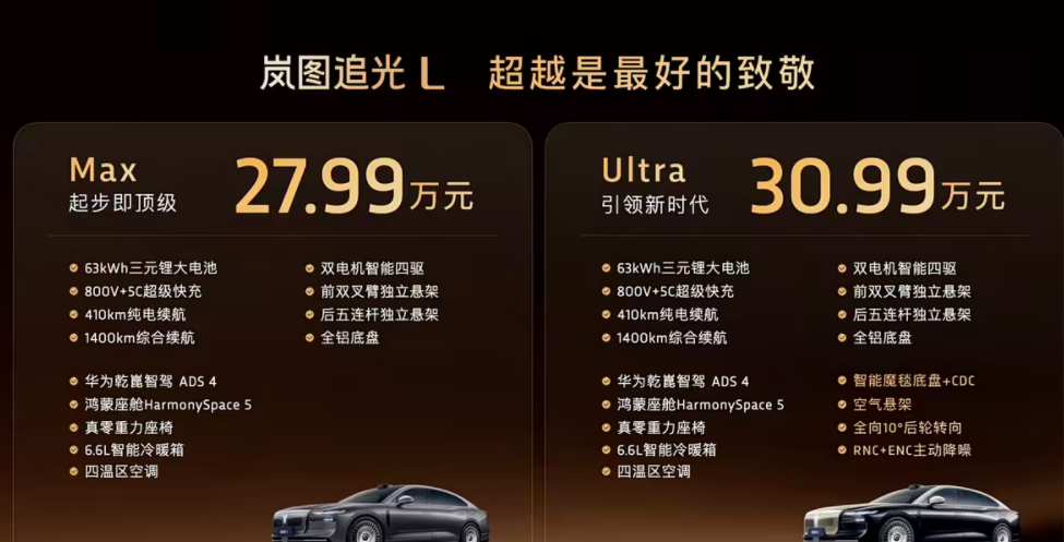综上所述,不难发现岚图追光L在采用全新家族语言之后确实会显得更加豪华,能够体现出行政级轿车该有的调性。相比之下,无论是岚图追光L,还是岚图梦想家、岚图泰山,这几款车型所营造出的豪华氛围,还真比同价位和同级别车型更浓郁。而除此之外,岚图追光L还配备了4.0版本的华为乾崑ADS和鸿蒙座舱系统,华为“全家桶”的加入,再加上岚图本身就很不错的机械素质,以及更高效的充电体验和长达410km的纯电续航,这些都会让岚图追光L具备更强的产品竞争力。所以看到最后,大家觉得岚图追光L这款车能否获得令人满意的销量?不妨在评论区留言。