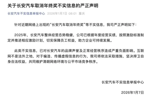 1月7日消息,长安汽车不实信息举报中心今日发文称,针对近期网络上出现的“长安汽车取消年终奖”等不实信息,公司严正声明如下: